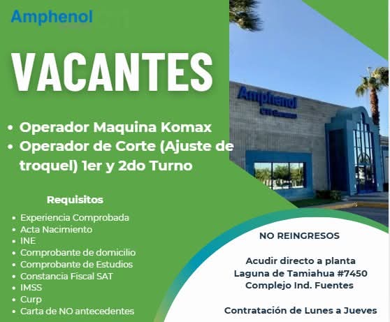 📍 En Planta Norte: Calle Magneto #1810, Parque Industrial Fernández. Horario de entrevistas: 6:00 am a 1:00pm