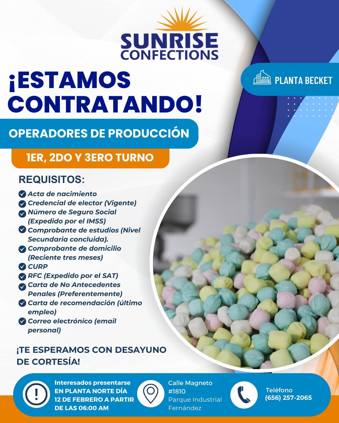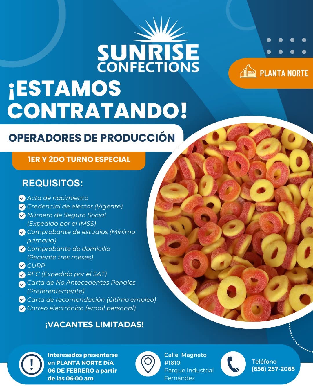 🍭 ¡ÚNETE A LA FAMILIA SUNRISE CONFECTIONS! Estamos contratando OPERADORES DE PRODUCCIÓN para Planta Jerónimo 🏭