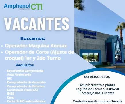 Interesados favor de presentarse mañana (12 de febrero) directamente en planta a las 6:30 a.m. para proceso de contratación.