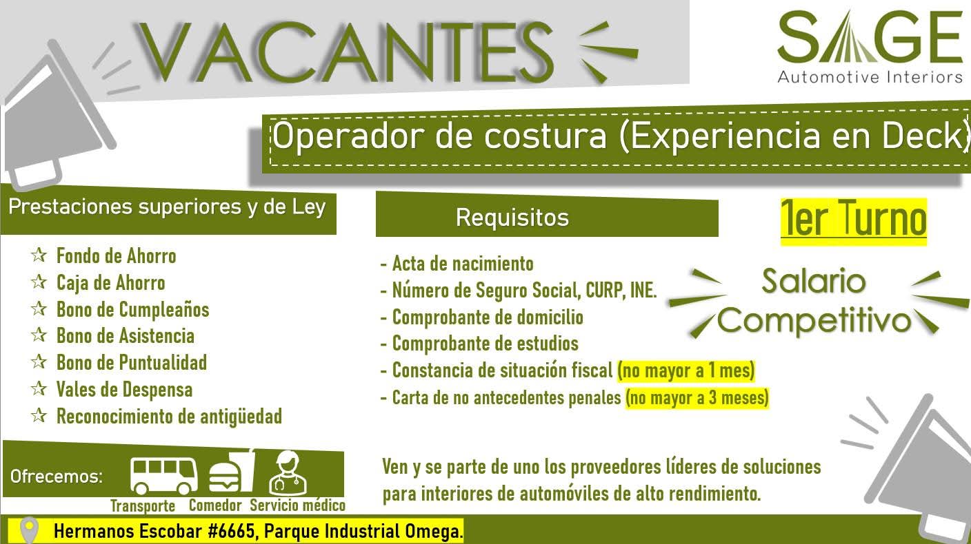 Nueva posición disponible Operador de Costura – 1er turno Contamos con transporte para las siguientes rutas: