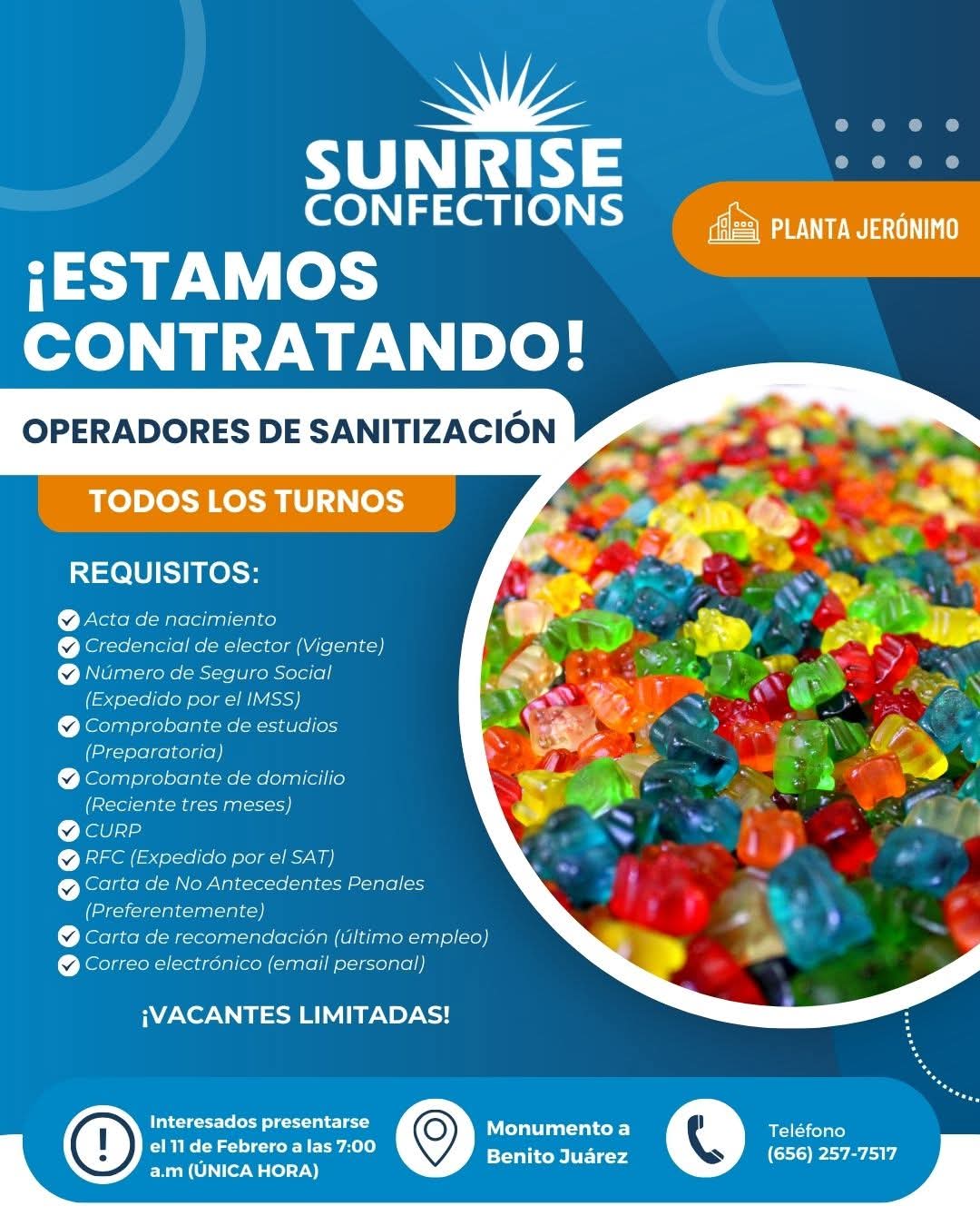 ¡ÚNETE A LA FAMILIA SUNRISE CONFECTIONS!🍭Estamos contratando OPERADORES DE PRODUCCIÓN para Planta Jerónimo. 🏭 🕒 ¡Preséntate el 05 DE FEBRERO a las 7:00 A.M! 📍 Punto de encuentro: Monumento a Benito Juárez Hora de llegada: 7:00 A.M (ÚNICO HORARIO) 🚌 El transporte los trasladará desde el Monumento a Benito Juárez hasta Planta Jerónimo para llevar a cabo su proceso de contratación. ¿Qué te ofrecemos? ✅ Fondo de ahorro del 10% (desde tu 1er semana) ✅ Prima vacacional del 40% ✅ Aguinaldo de 17 a 30 días (según antigüedad) ✅ Vales de despensa para tu mandado ⚠️ Experiencia en maquila indispensable ⚠️ 📞 Dudas al: (656) 257-7517