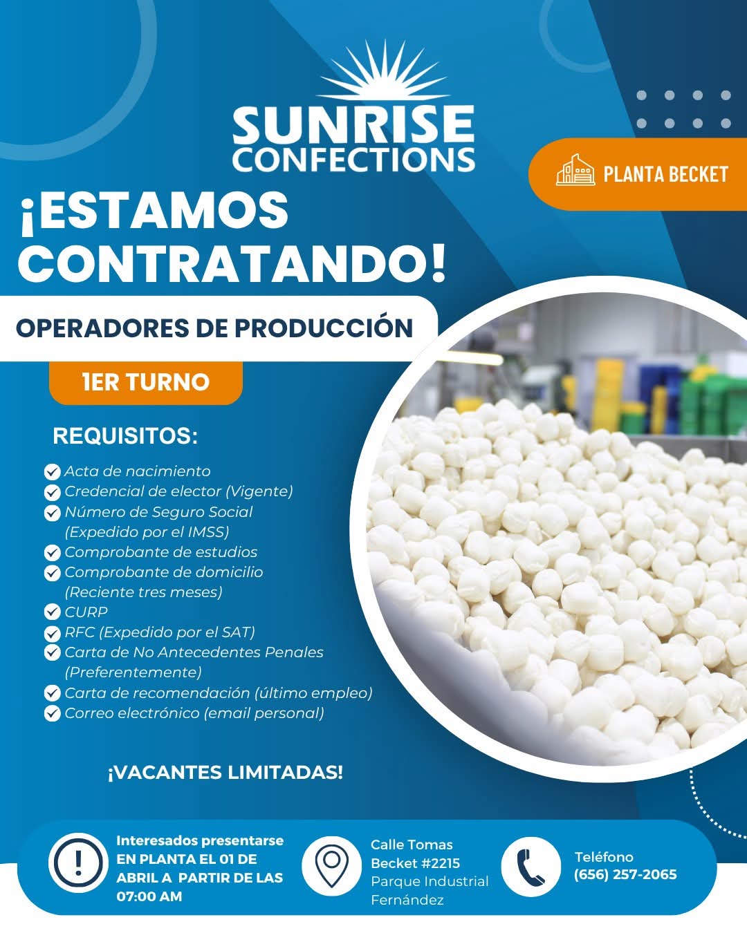 🔹 Entrevistas: Martes 31 de marzo. 🕕 Horario: De 7:00 a.m. a 1:00 p.m. 📍 Lugar: Planta Becket – Calle Tomas Becket #2215 Parque Industrial Fernández