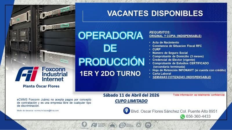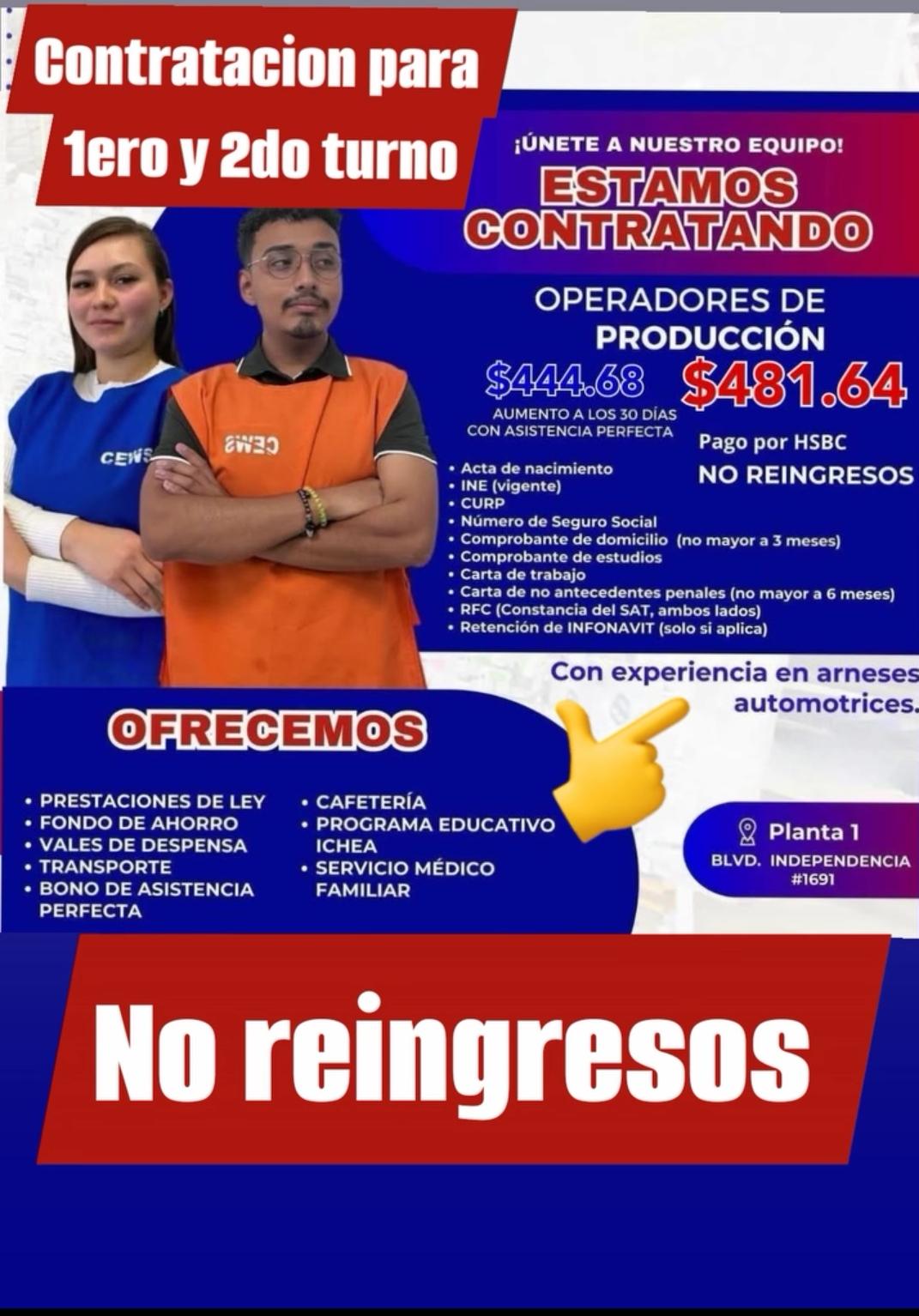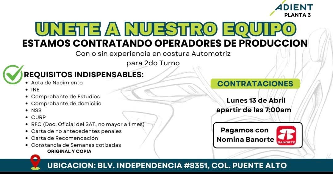📢 ¡ESTAMOS CONTRATANDO OPERADORES DE PRODUCCIÓN!🎯 ¡ÚLTIMAS VACANTES! 🕓 Turnos disponibles: ✅ 1ER TURNO (6:00 AM - 15:30 PM) 🔹 Entrevistas: Miércoles 01 de abril. 🕕 Horario: De 7:00 a.m. a 1:00 p.m. 📍 Lugar: Planta Becket – Calle Tomas Becket #2215 Parque Industrial Fernández ⚠️ Experiencia en maquila indispensable ⚠️ Llevar documentación completa Vestimenta adecuada para ingresar a piso de producción: 👕 Calzado cerrado 👖 Pantalón sin rupturas 🚫 Sin maquillaje, anillos, pulseras ni accesorios 💰 Ofrecemos: 🤑Ofrecemos: 💸 Fondo de ahorro del 10% desde la primera semana 🌴 Prima vacacional del 40% 💸 Aguinaldo de 17 a 30 días según antigüedad 💳 Vales de despensa