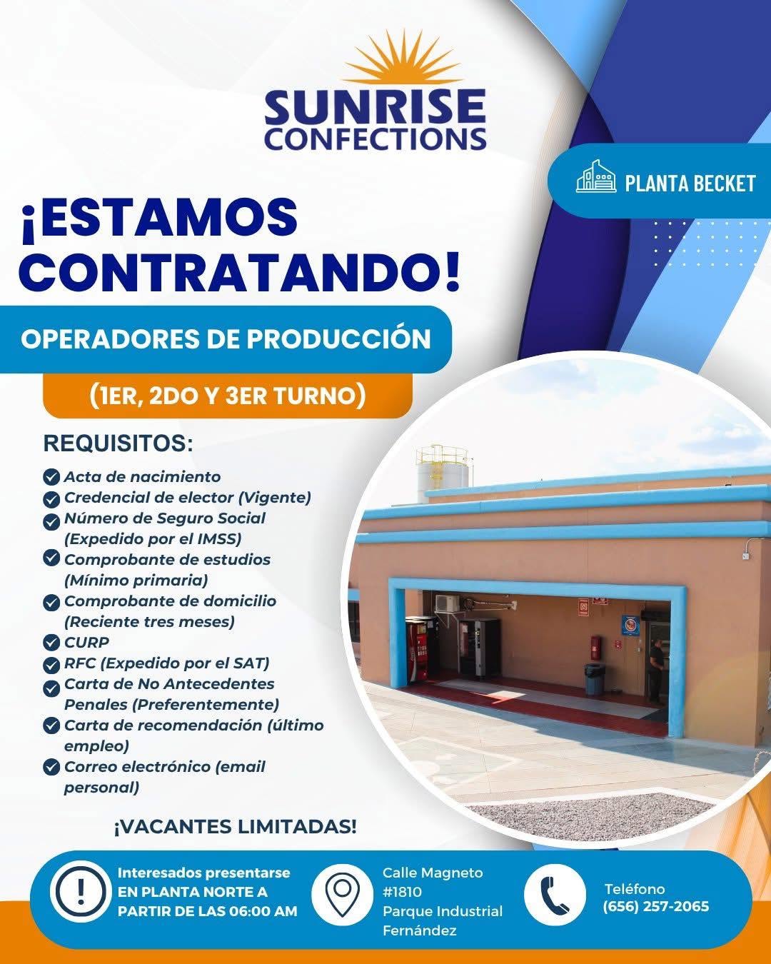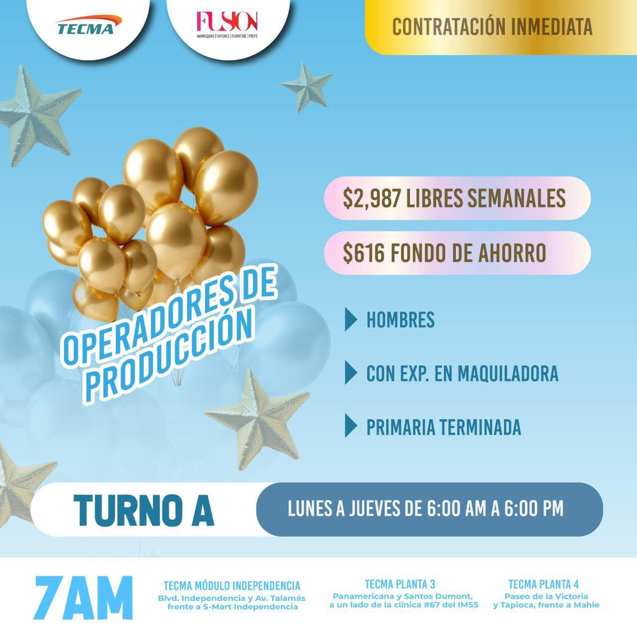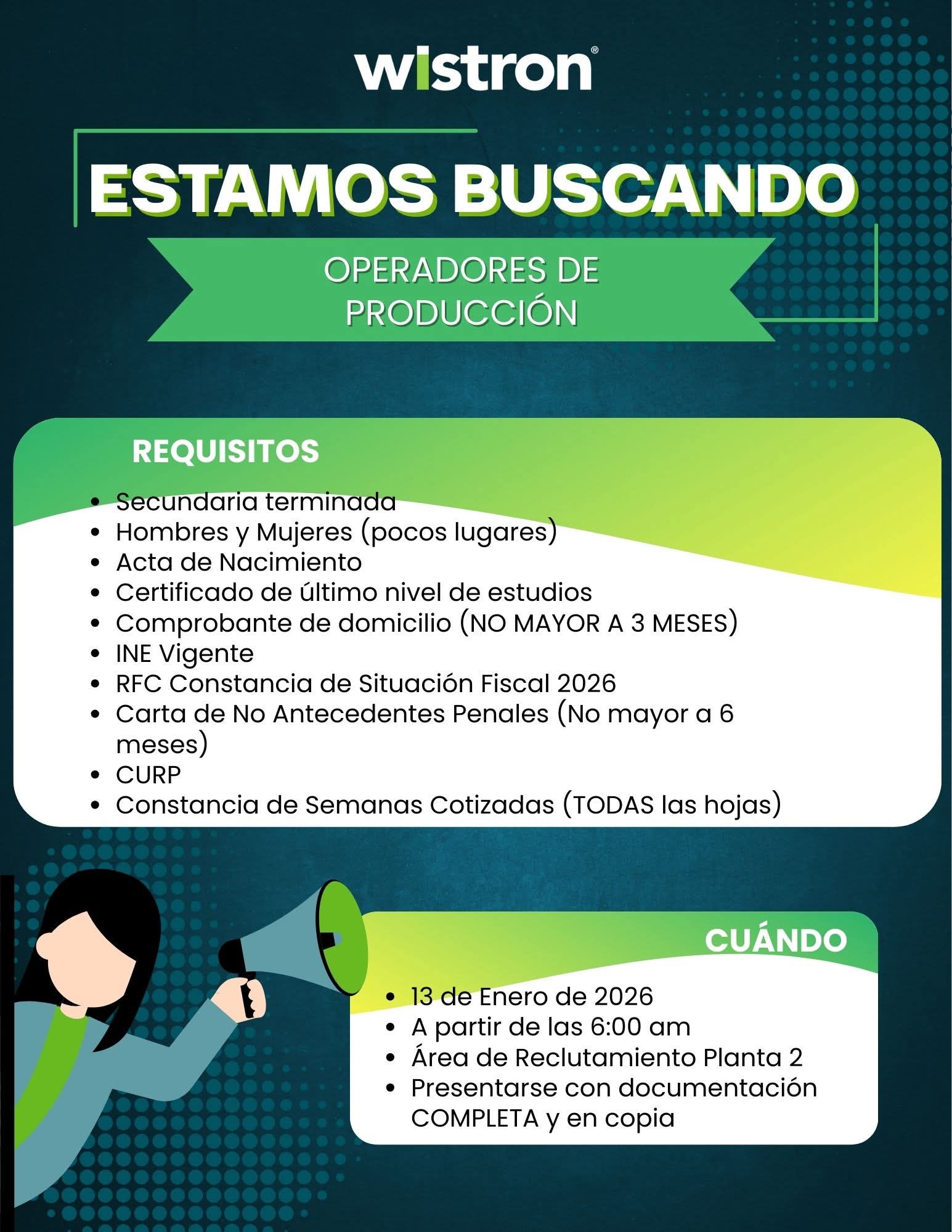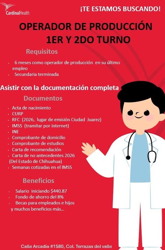OPERADORES DE PRODUCCIÓN PARA 1ER TURNO (6:00 am - 3:30 pm) 📅 Martes 13 de Enero de 2026 🕕 A partir de las 6:00 am 📍Área de Reclutamiento Planta 2 (C. Baudelio Pérez Mucharras #420 Col. Paseos de Zaragoza CP. 32550) https://maps.app.goo.gl/BV1x7b1a1XgK4gE9A