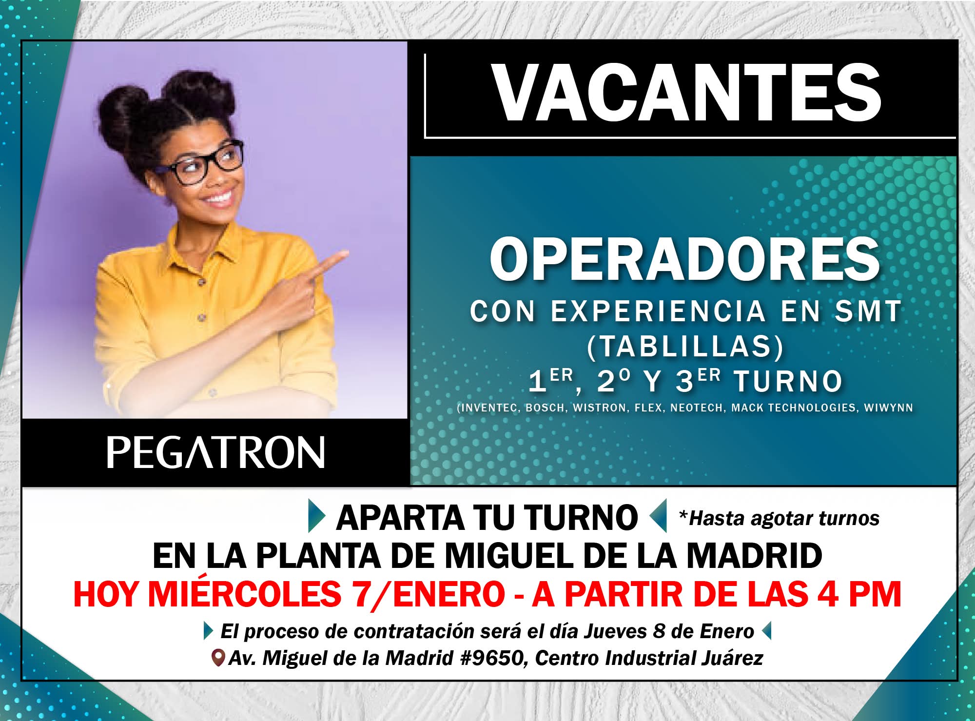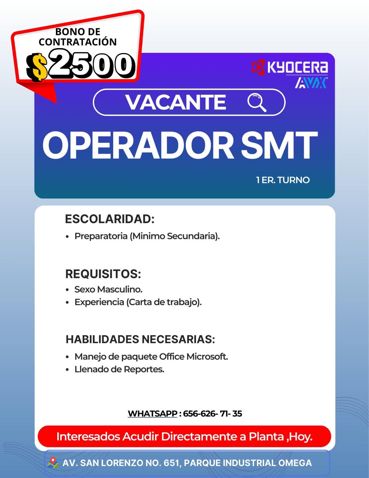 Vacantes: 🔸Operadores SMT - 1er, 2o y 3er Turno - Planta F0 (Miguel de la Madrid)