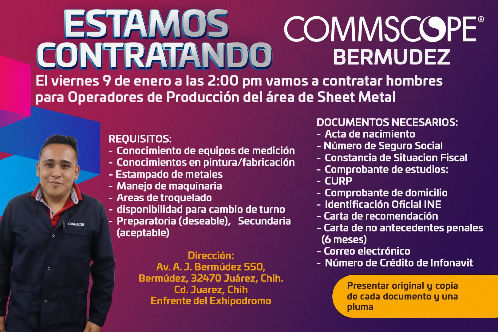 🚩 Proximo Lunes 12 de enero 2026 de 7:00 a 09:00 a. m. 🚩 Vacantes para 1ro y 2do turno, Hombres con preparatoria terminada. 🚩 Vacantes para 3er turno, Hombres con preparatoria terminada solo personal que viva en anapra. 🚩 Contratación en 3er turno sujeto a disponibilidad de transporte. 🚩 No debe faltar ningún documento. 🚩 Se revisa estabilidad laboral. 🚩 Reingresos llegar a las 8:00 a.m ,en los puntos les dicen si son recontratables.