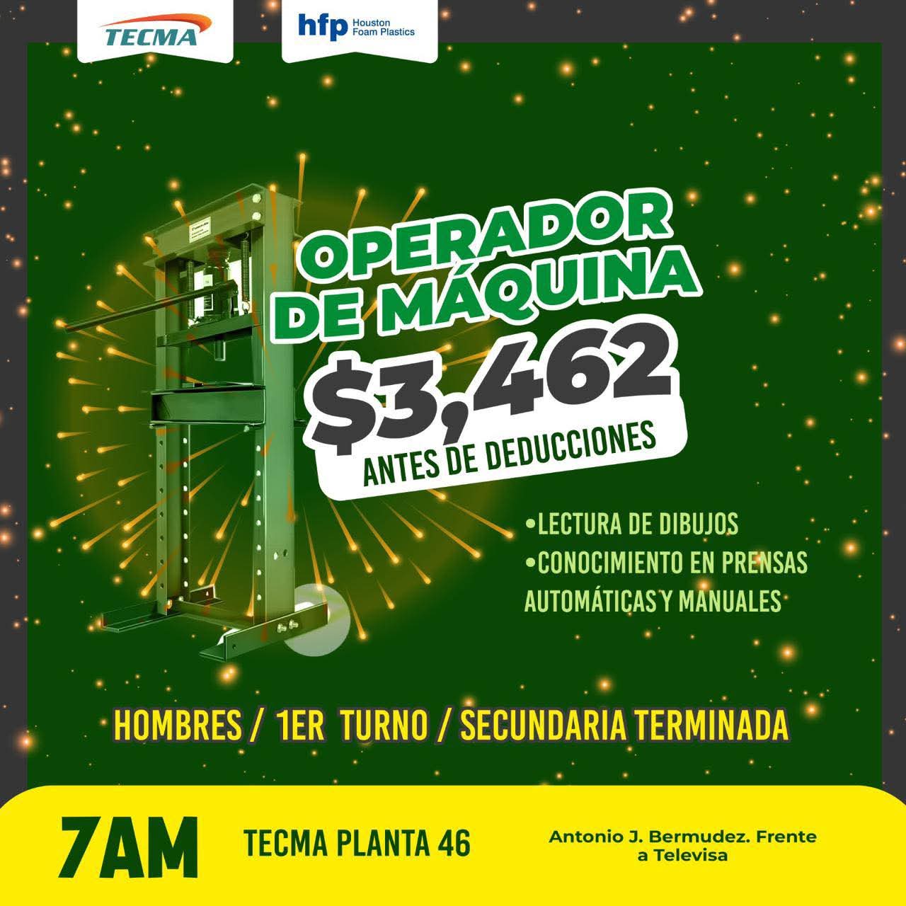 Hombres de 18 a 55 años✅ Secundaria terminada✅ Lectura de Dibujos (Especificaciónes)✅ Conocimiento en prensas automáticas y manuales✅ Cinta de medir✅