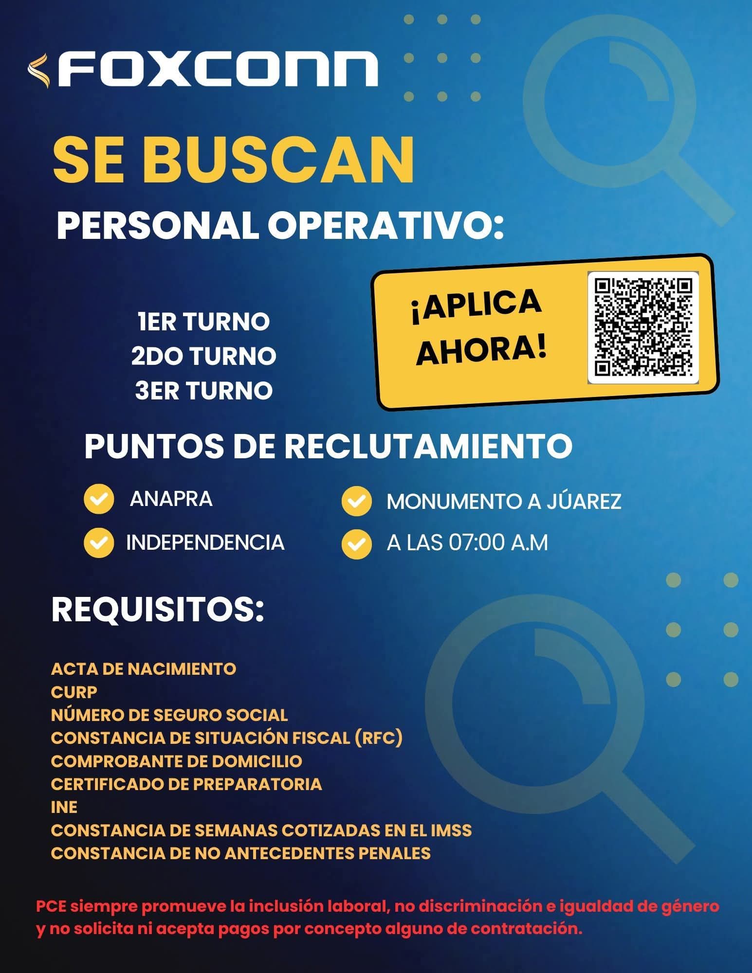 📢 ¡ESTAMOS CONTRATANDO OPERADORES DE PRODUCCIÓN! Información: 🕕 Horario de entrevistas: De 06:00 am a 01:00 pm 📍 Interesados acudir a Planta Norte en Parque Industrial Fernández: Calle Magneto #1810 🔵Lleva tu documentación completa. 👕 Con vestimenta adecuada para entrar a piso de producción (calzado cerrado, pantalones sin rupturas, no maquillaje, no anillos, pulseras o accesorios) ⚠️ Experiencia en maquila indispensable ⚠️ 🤑Ofrecemos: 💸 Fondo de ahorro del 10% desde la primera semana 🌴 Prima vacacional del 40% 💸 Aguinaldo de 17 a 30 días según antigüedad 💳 Vales de despensas 📌 Turno disponible: ✅ 1ER TURNO - Lunes a Viernes (6:00 AM - 15:30 PM) ✅ 2DO TURNO - Lunes a Viernes (15:15 PM a 23:25 PM) ✅ 3ER TURNO - Lunes a Viernes (23:10 PM a 6:10 AM)