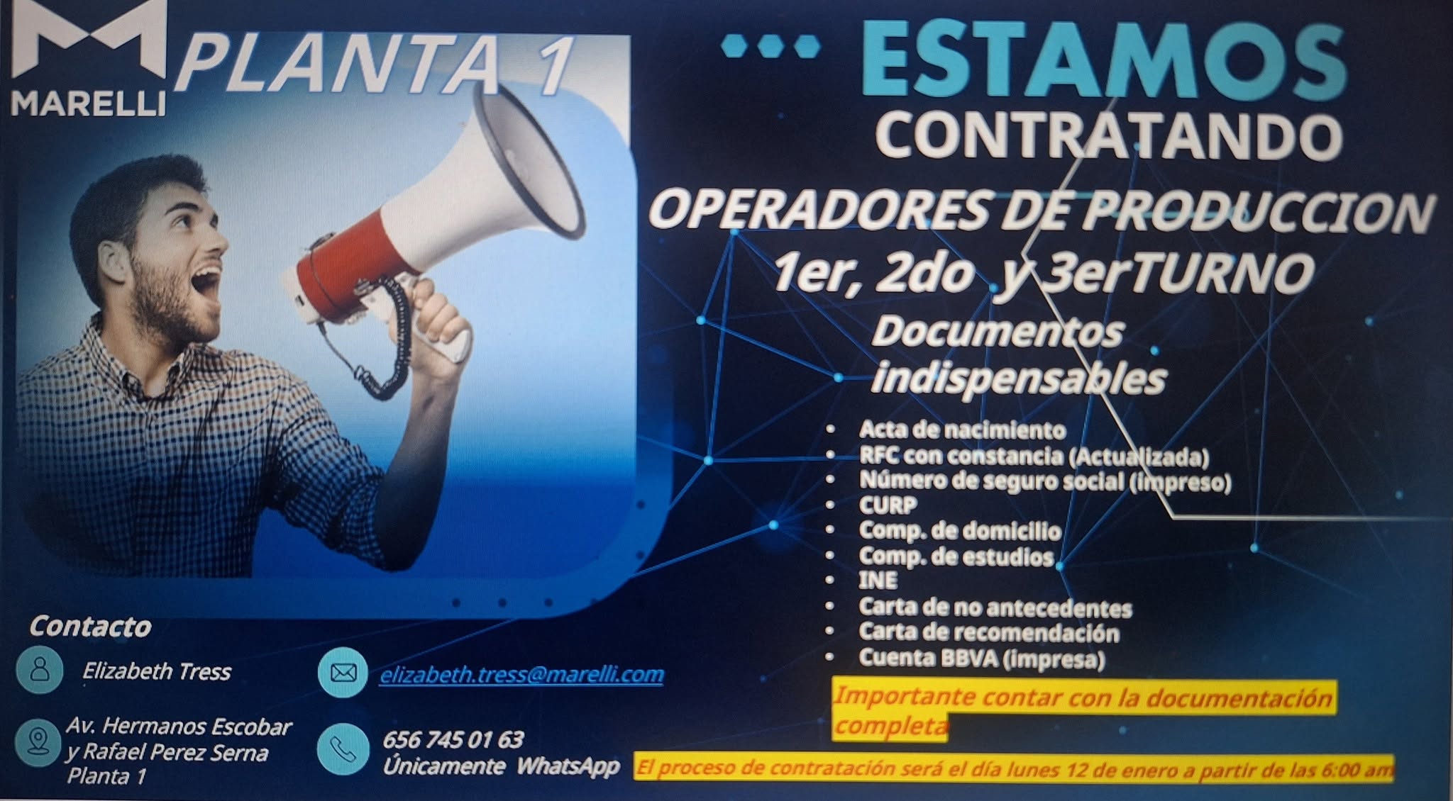Estaremos contratando este lunes 12 de Enero, de 2026 en Marelli Planta 1. A partir de las 6:00 am.