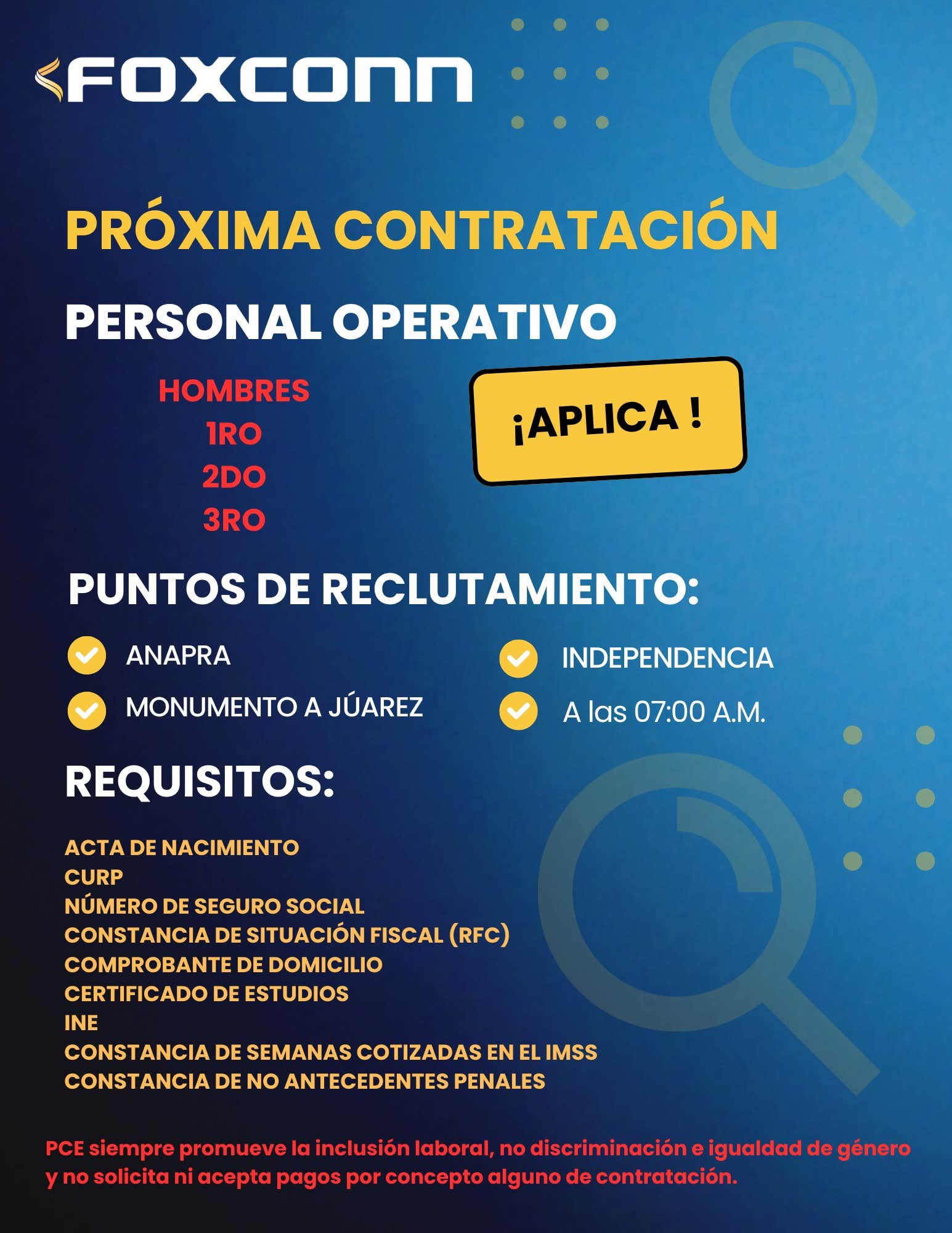 🚩 Mañana Viernes 09 de enero 2026 de 7:00 a 09:00 a. m. No 🚩 Vacantes para 1ro y 2do turno, Hombres con primaria terminada. 🚩 Vacantes para 3er turno, Hombres con primaria terminada solo personal que viva en anapra. 🚩 Contratación en 3er turno sujeto a disponibilidad de transporte. 🚩 No debe faltar ningún documento. 🚩 Se revisa estabilidad laboral. 🚩 Reingresos llegar a las 8:00 a.m ,en los puntos les dicen si son recontratables. 🚨Tramita aquí la constancia de no antecedentes penales 👇 https://tramites.chihuahua.gob.mx/tramite.aspx?identificador=43&tramite=Constancia%20de%20Antecedentes%20Penales&dependencia=Fiscal%C3%ADa%20General%20del%20Estado