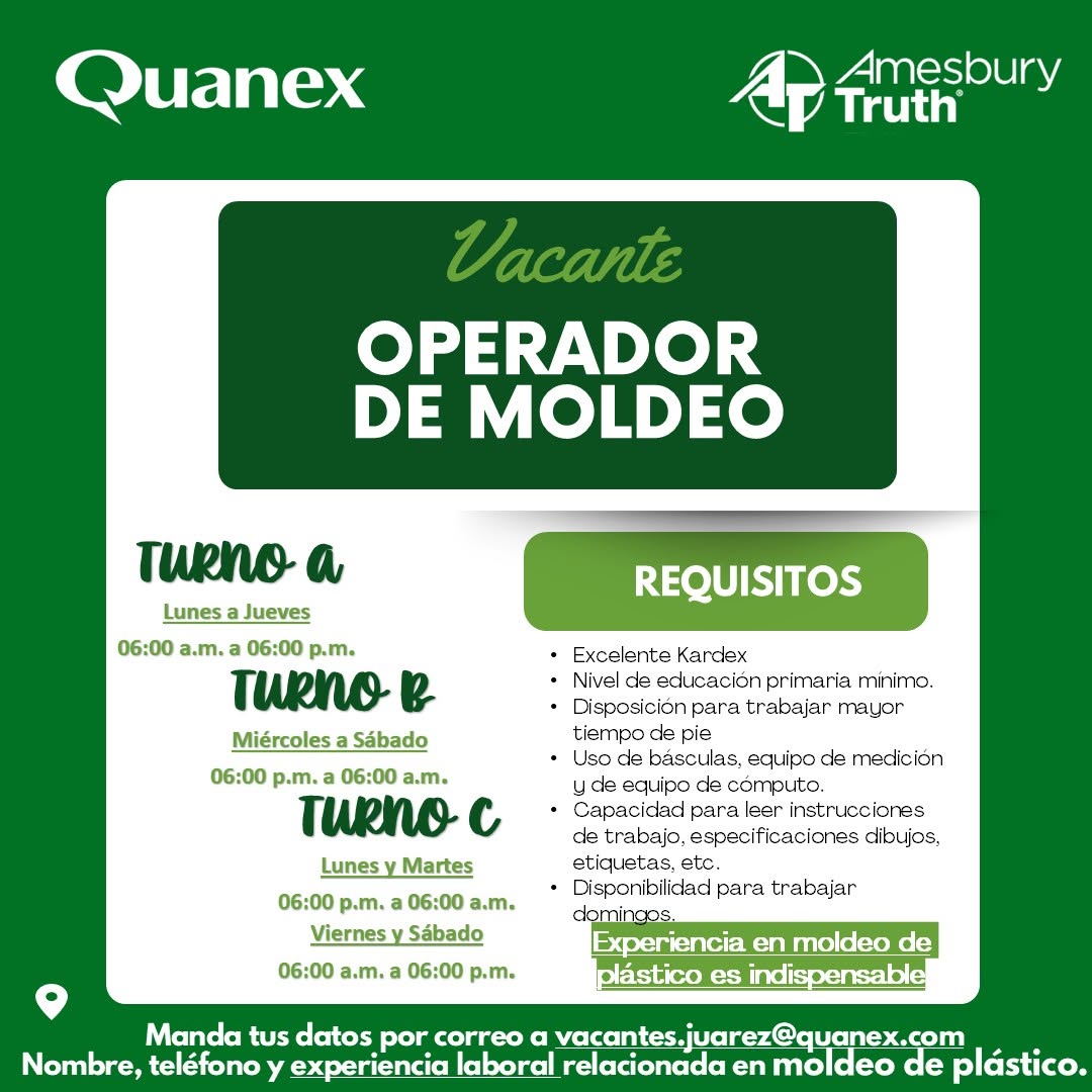 ¿Tienes experiencia trabajando en moldeo de plástico? Mandamos tu información laboral a vacantes.juarez@quanex.com