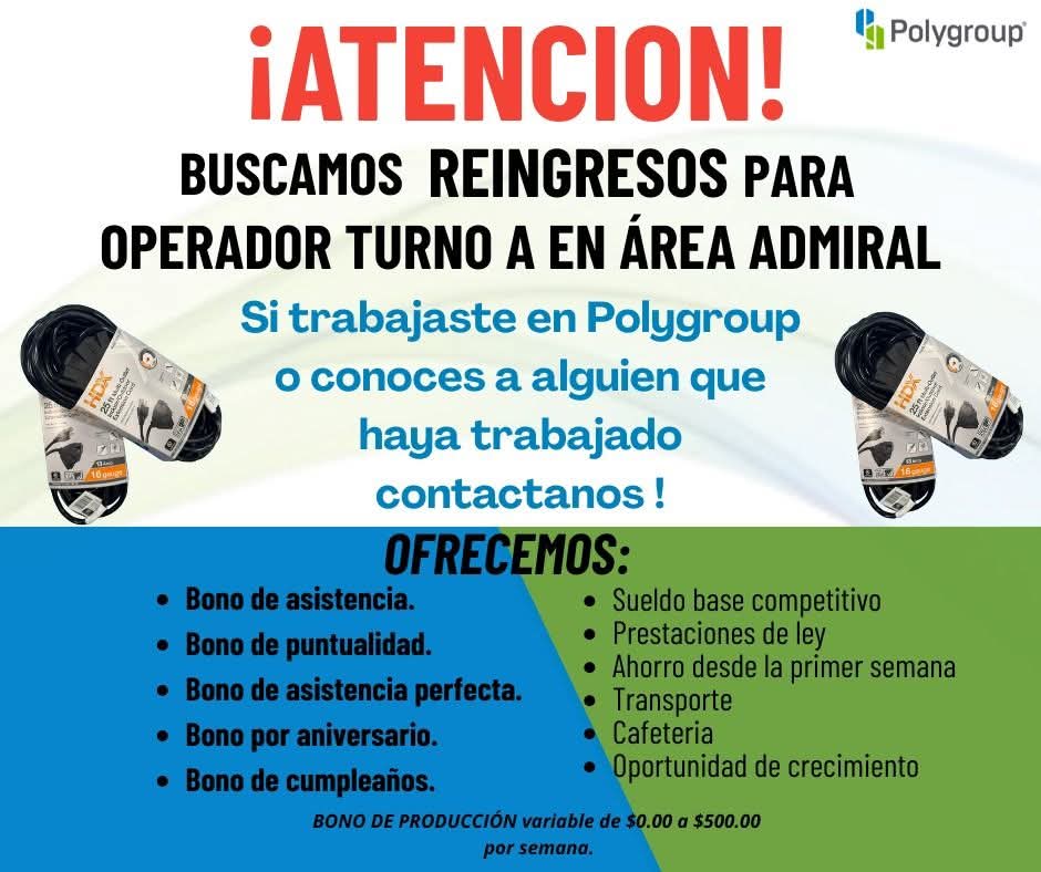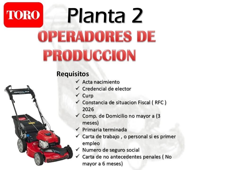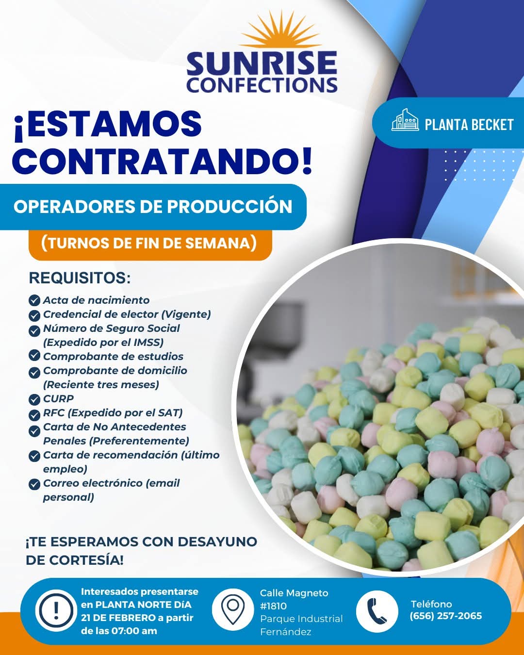 8 lugares para primer turno de Lunes a viernes de 6:30am a 4:00pm