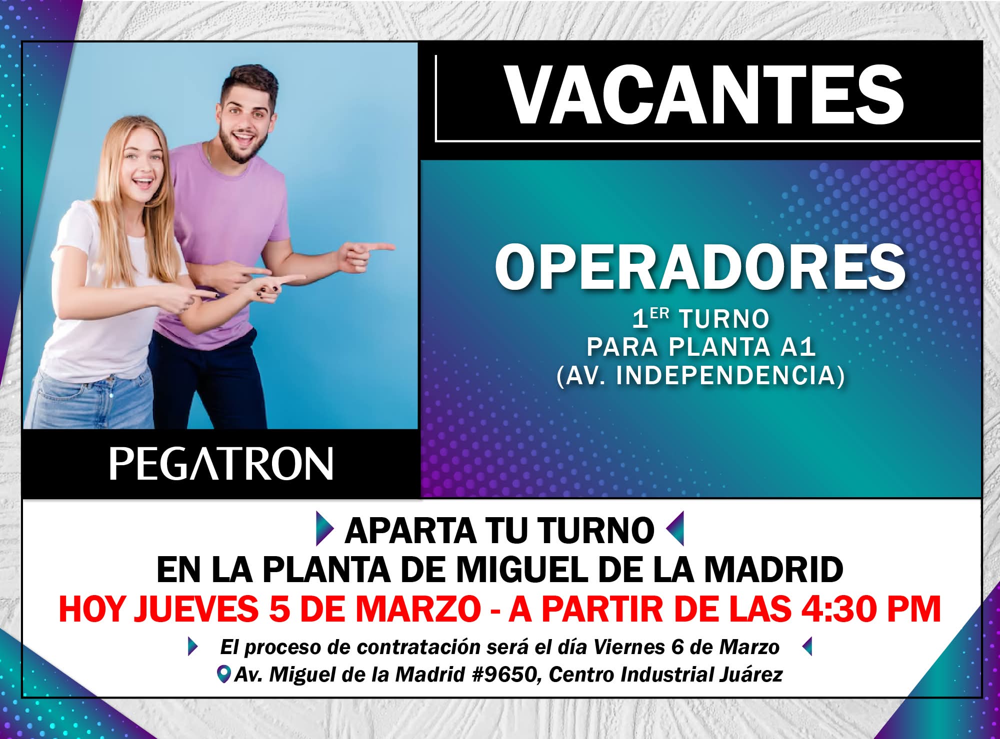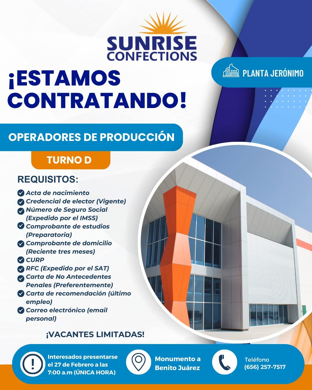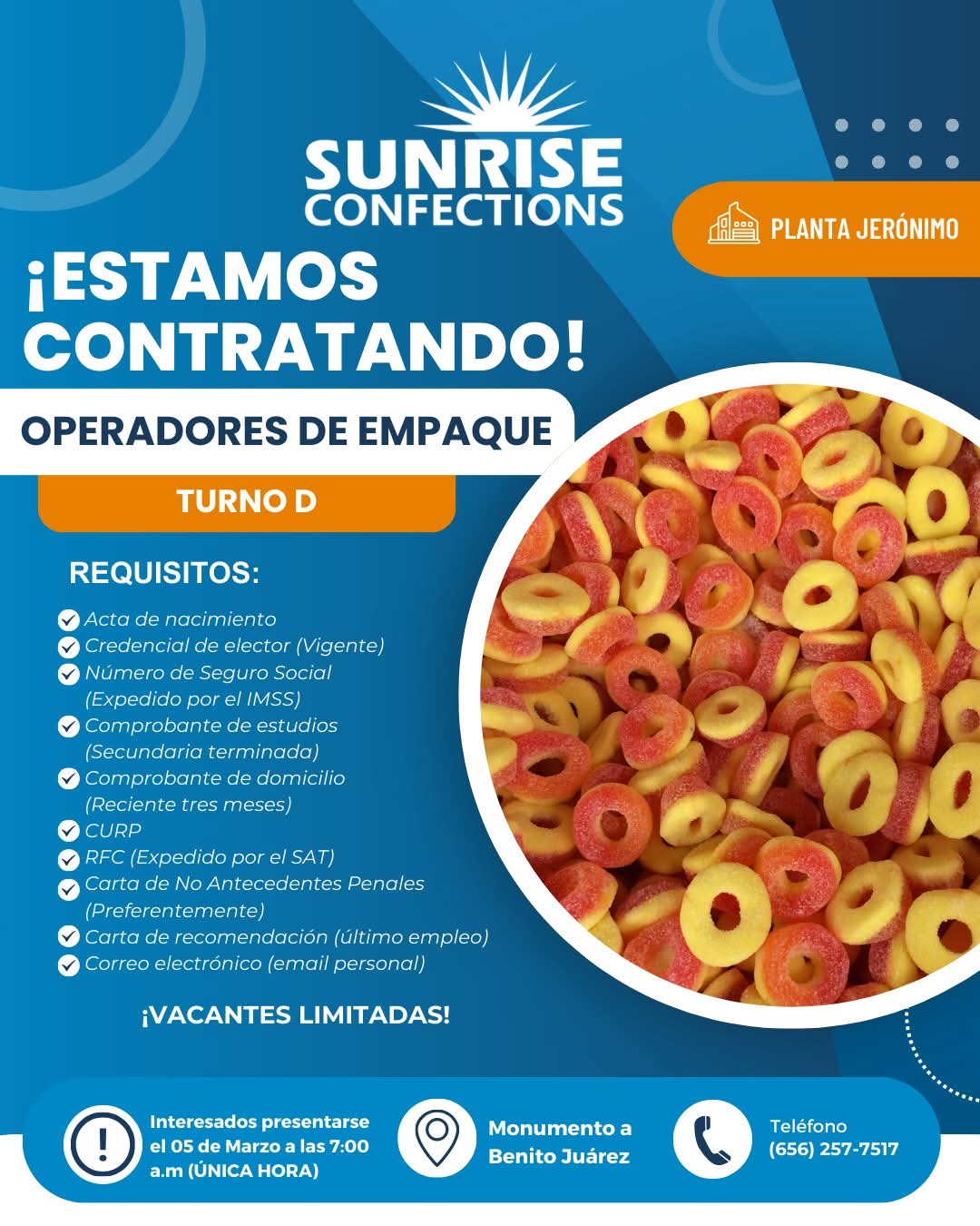 ↗️El proceso de contratación y recepción de personal será lunes 02 de marzo (10 lugares únicamente , ) a las 6:15 am ( importante ser puntuales , no es necesario acampar ni apartar lugar ) en dirección: