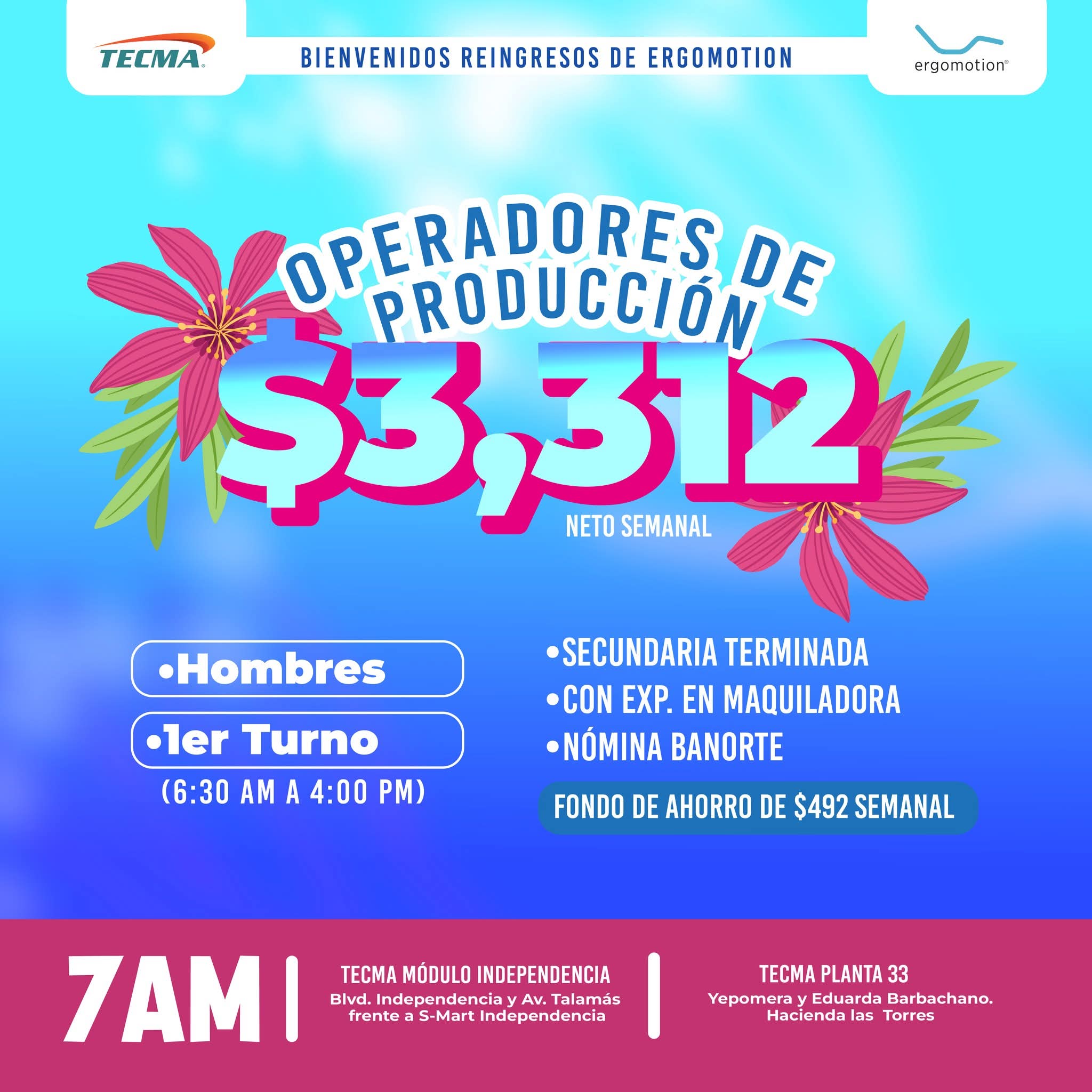 🔹 Solo primer turno disponible 🔹Transporte disponible (sujeto a revisión): - Las Haciendas - Palmas - Finca - San José - Portales - Castillo Peraza - Riveras del Bravo ( solo hasta la etapa 8 ) - Azteca https://whatsapp.com/channel/0029VaKCuDKG3R3im3fd5N0A