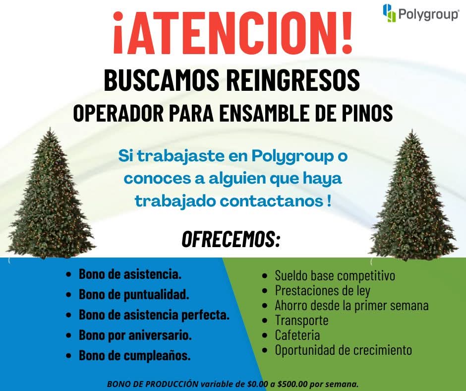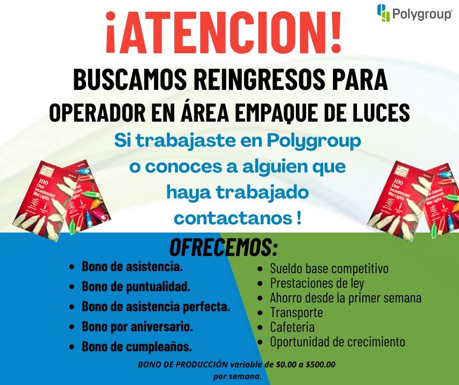 BUSCAMOS REINGRESOS DEL 🚨ÁREA DE ENREDADO DE LUCES🚨PARA OPERADORES DE PRODUCCIÓN❗❗(POCOS LUGARES)🔵1ER TURNO ÁREA DE ENREDADO DE LUCES (HOMBRES Y MUJERES) Si eres reingreso, envia tu nombre completo por favor por WhatsApp a uno de los siguientes números: 📞656-440-16-86 📞656-409-05-96 📞656-418-47-44