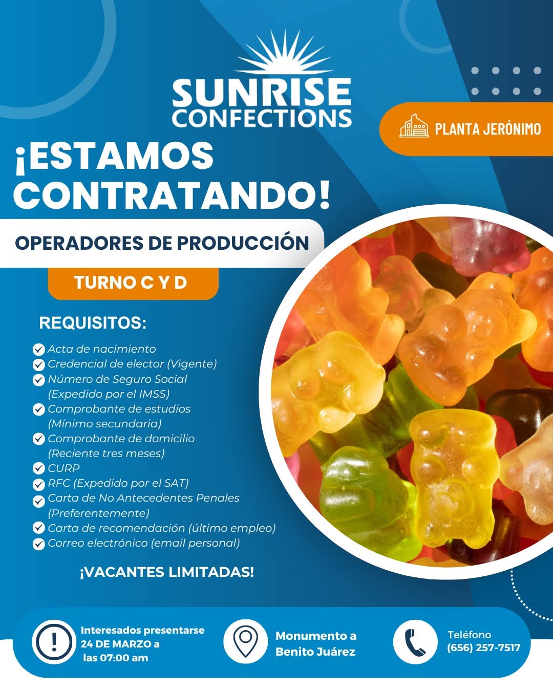 📢 ¡CONTRATACIONES MAÑANA MARTES 24 DE MARZO! ESTAREMOS CONTRATANDO Operadores de Producción en Sunrise Planta Jerónimo! 📢 Información: 📅 Martes 24 de marzo a las 07:00 AM 📍 Presentarse en Punto de Reclutamiento Monumento a Benito Juárez (donde serán trasladados a Planta para iniciar su proceso) 🔵Lleva tu documentación completa. 👕 Con vestimenta adecuada para entrar a piso de producción (calzado cerrado, pantalones sin rupturas, no maquillaje, no anillos, pulseras o accesorios) ⚠️ Trabajo pesado, experiencia en maquila indispensable ⚠️ 🔵Turnos disponibles: 🟢 TURNO C: Jueves a domingo | 6:00 AM - 6:00 PM 🟢 TURNO D: Jueves a domingo | 6:00 PM - 6:00 AM 🤑Ofrecemos: 💸 Fondo de ahorro del 10% desde la primera semana 🌴 Prima vacacional del 40% 💸 Aguinaldo de 17 a 30 días según antigüedad 💳 Vales de despensa ⚠️VACANTES LIMITADAS⚠️