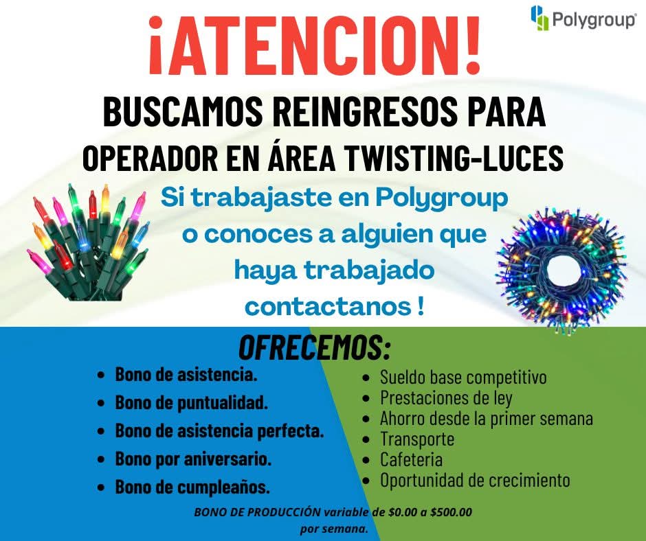 BUSCAMOS REINGRESOS DEL 🚨ÁREA TWISTING-LUCES🚨PARA OPERADORES DE PRODUCCIÓN❗❗🔵MUJERES 1ER TURNO 🟢HOMBRES 1ER TURNO Si eres reingreso, por favor envia tu nombre completo por WhatsApp a uno de los siguientes números: 📞656-440-16-86 📞656-418-47-44 📞656-409-05-96