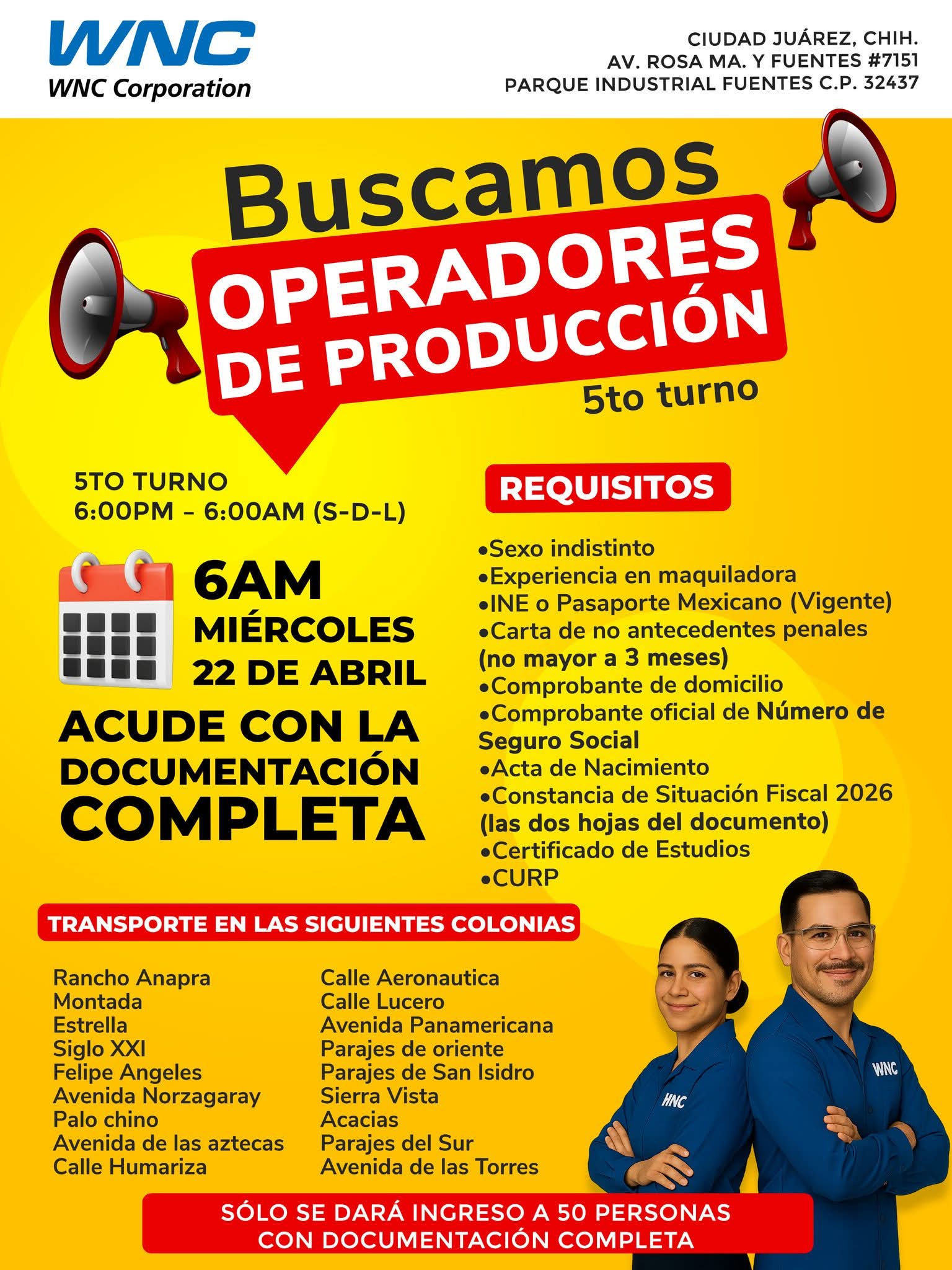 📣 ¡Forma parte de WNC! Buscamos operadores y operadoras de producción para 5to turno.