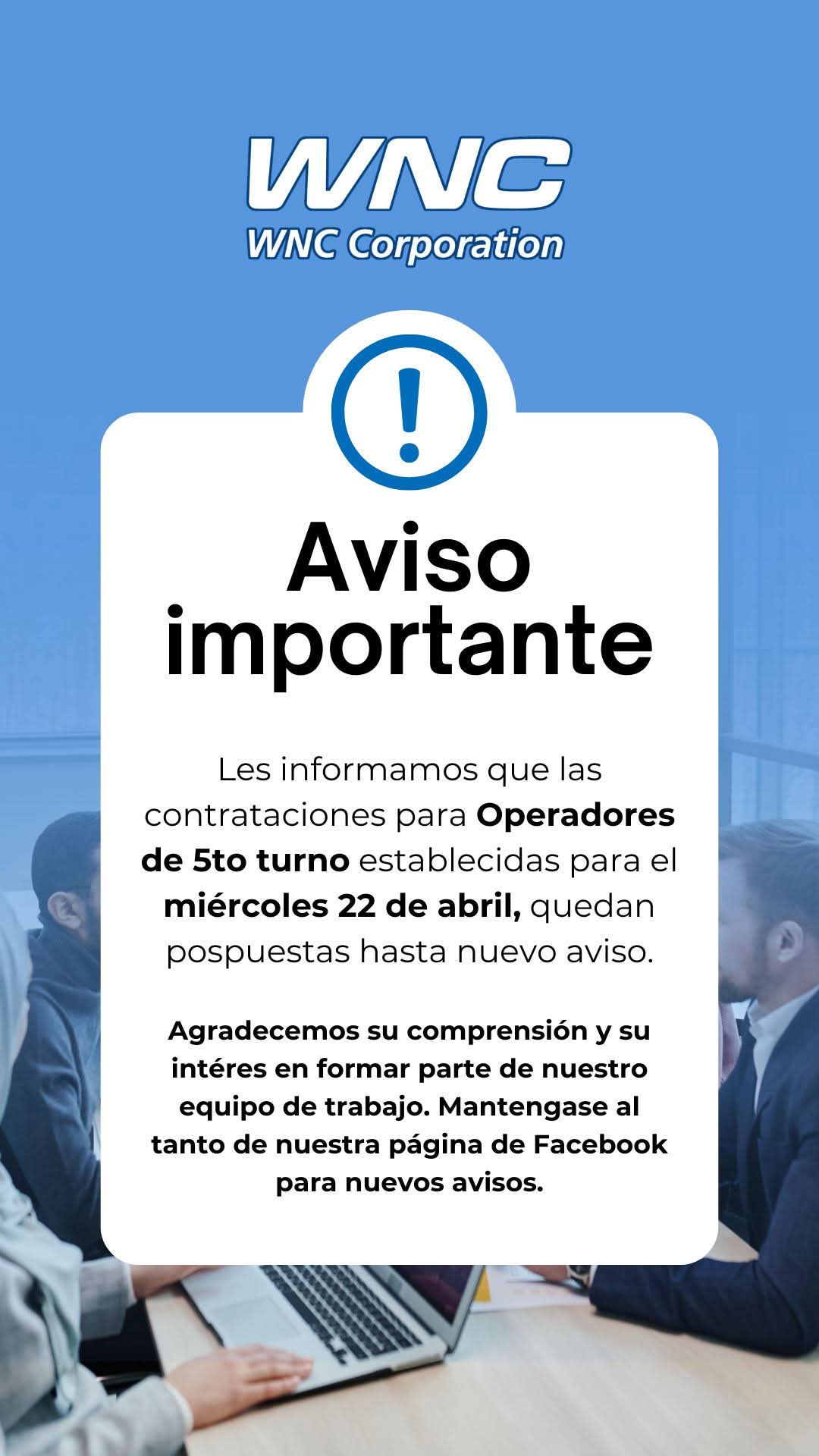 Les informamos que las contrataciones para Operadores de 5to turno establecidas para el miércoles 22 de abril, quedan pospuestas hasta nuevo aviso.