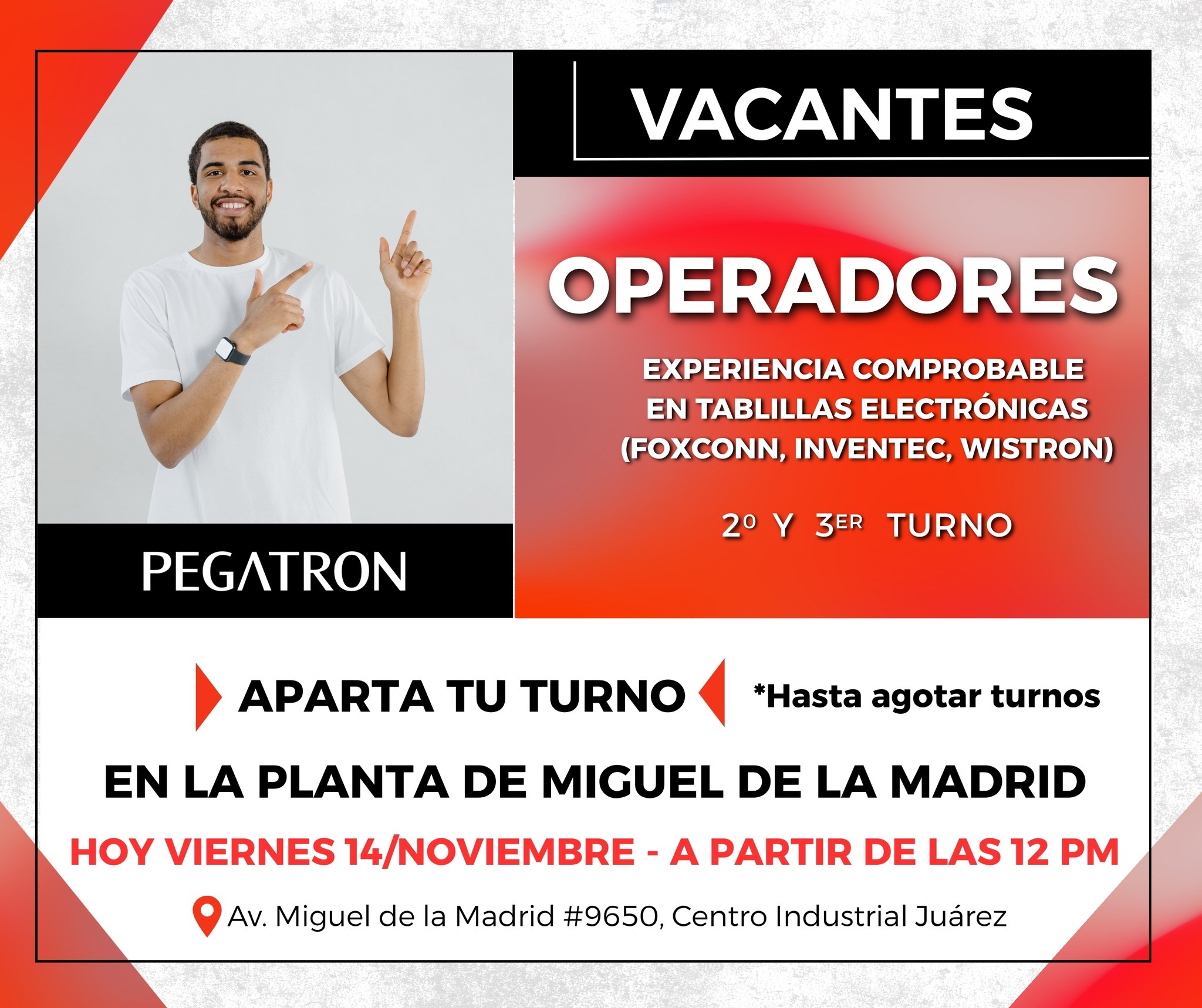 🚨🚨🚨🚨VACANTES DISPONIBLES!!!!! 🔰SE PARTE DE NUESTRO GRAN EQUIPO DE TRABAJO. 🚨Pegatron México Contrataciones ⚠️⚠️⚠️ASISTE HOYVIERNES 14 DE NOVIEMBRE⚠️⚠️⚠️ directamente a la planta de Miguel de la Madrid. Porceso de contratación MARTES 18 DE NOVIEMBRE *NO se apartan lugares por redes sociales. *NO TENEMOS REINGRESOS Vacantes: 🔸Operadores con experiencia en tablillas electrónicas - 2do y 3er Turno - Planta F0 (Av. Miguel de la Madrid) 🔵REQUISITOS🔵 📁 📝 🪪 ACUDE CON LA PAPELERÍA 👏👏COMPLETA EN COPIAS 👏👏 ⭐ACTA DE NACIMIENTO ⭐CURP ⭐️NÚMERO DE SEGURO SOCIAL ⭐️RFC [CONSTANCIA FISCAL] ⭐CREDENCIAL DE ELECTOR ⭐COMPROBANTE DE DOMICILIO ⭐CRETIFICADO DE ESTUDIOS (Secundaria) ⭐️NÚMERO DE SEGURO SOCIAL ⭐CARTA DE NO ANTECEDENTES PENALES ⭐PLUMA 🤩CONTAMOS CON PRESTACIONES DE LEY Y SUPERIORES🤩 📌15 DÍAS DE AGUINALDO 📌FONDO DE AHORRO 📌UTILIDADES 📌BONOS POR ASISTENCIA PERFECTA Y PUNTUALIDAD 📌PAGO SEMANAL 📌HORARIOS FIJOS 🚌🚌🚌🚌🚌 TRANSPORTE DE F0/F1 DISPONIBLE PARA COLONIAS: 🚌Sierra vista 🚌Jardines de Roma 1 🚌Cerradas de santa Isabel 🚌Las haciendas 🚌Mezquital 🚌Praderas del sol 🚌Terranova 🚌Parajes del sur (Paseo del sur/Mar del sur/Bahia blanca) 🚌Cerradas de san pedro 1 & 4 🚌Priv. Florencia 2,3,4 & 5 🚌Finca bonita 🚌Parajes de San Juan ll 🚌Cerradas del álamo 1 🚌Lomas del desierto 1,2,3 🚌Soneto 156 🚌Puerto Dunquerque 🚌Puerto de Palos 🚌Riveras 3,4,7,9 🚌KM20 🚌Parajes del sol 🚌Héroes de la revolución 🚌Yepomera 🚌🚌🚌🚌🚌🚌🚌🚌🚌 #pegatroncontrataciones