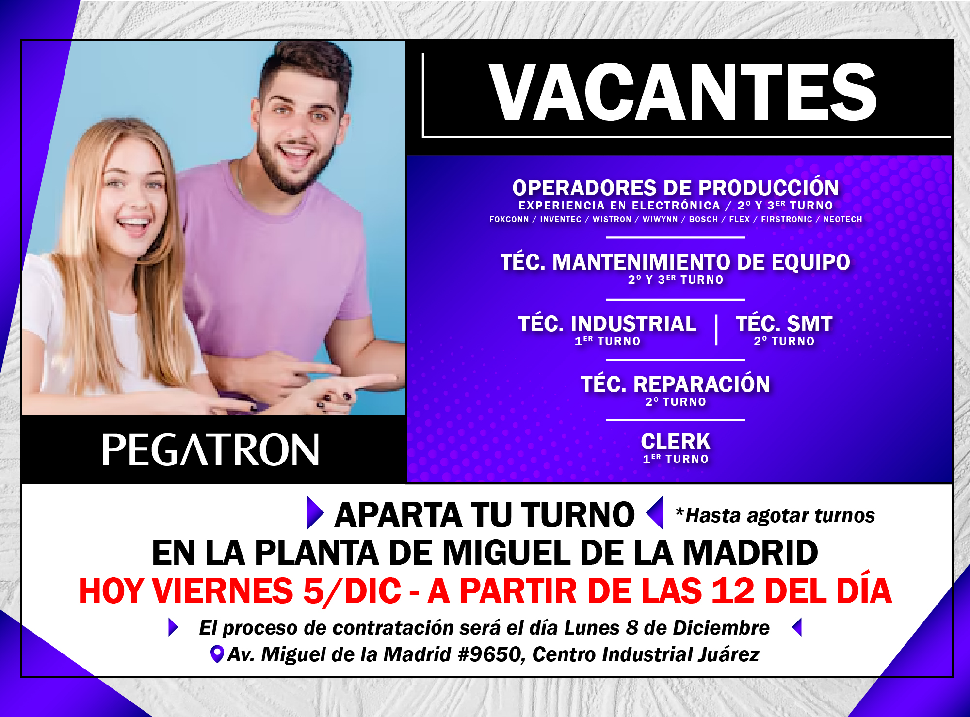 SE P ARTE DE NUESTRO GRAN EQUIPO DE TRABAJO. directamente a la planta de Miguel de la Madrid. *NO se apartan lugares por redes sociales. *NO TENEMOS REINGRESOS Vacantes:  Operadores de Producción con experiencia en electrónica - 1er, 2o y 3er Turno - Para Planta F0 (Miguel de la Madrid)  Clerk - 1er Turno - Para Planta A1 (Av. Independencia) MAQUILADORA |