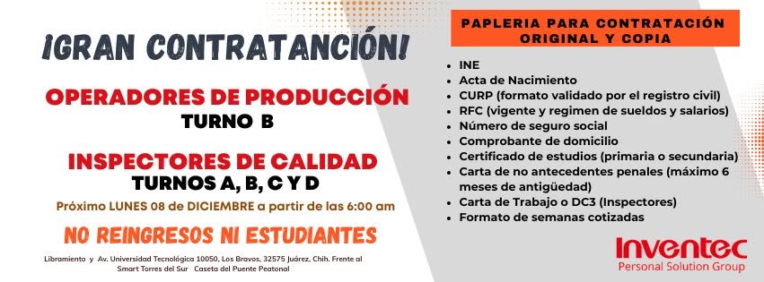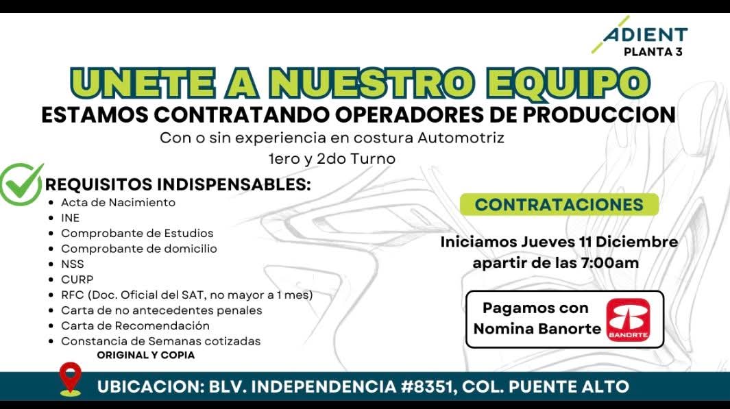 Buenas dia chic@s!  Espero estén teniendo una excelente dia El día de hoy Viernes 05 de Diciembre 2025, tendremos contratacion en Flex Automotive! en nuestra nueva ubicacion Blvr Independencia   Recibiremos personal para contratación el día de hoy viernes 05 de Diciembre 2025 Ingresaremos personal a partir de la 1:30pm en la caseta ubicada sobre la calle Hacienda el Alamillo, en la parte trasera de la planta Flex Sur. (dejamos mapa de referencia)  Que vivan al sur de la ciudad.  Turno disponible: -1er turno 6:00am a 15:30 pm (Lunes a Viernes)  Contamos con 30 vacantes con experiencia en arneses (área automotriz). No habrá listados, debido al requerimiento, se atenderá al personal de acuerdo a cómo se encuentren formad@s.  No contamos con sistema para reingresos.  Sugerencia llevar pluma negra u azul.  La induccion sera el dia lunes 08 de Diciembre 2025. En un horario de 06:00am a 3:30 pm (2 días) Excelente fin de semana para todos.