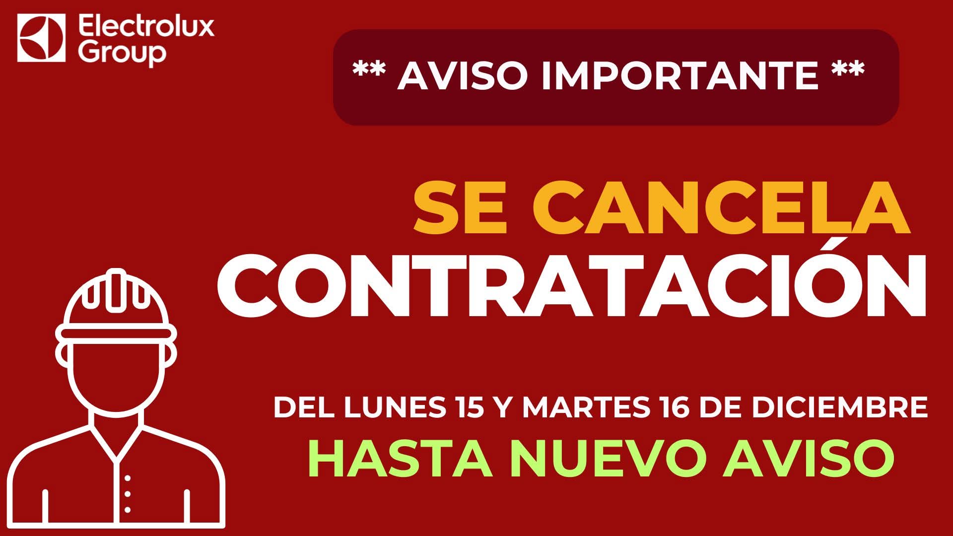 Te informamos que la contratación programada para este lunes 15 y martes 16 de diciembre queda cancelada hasta nuevo aviso.